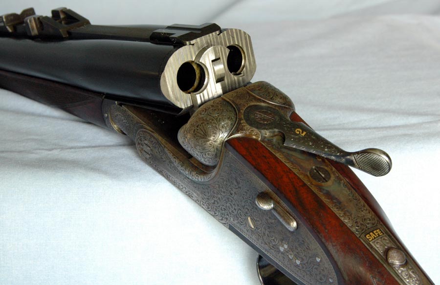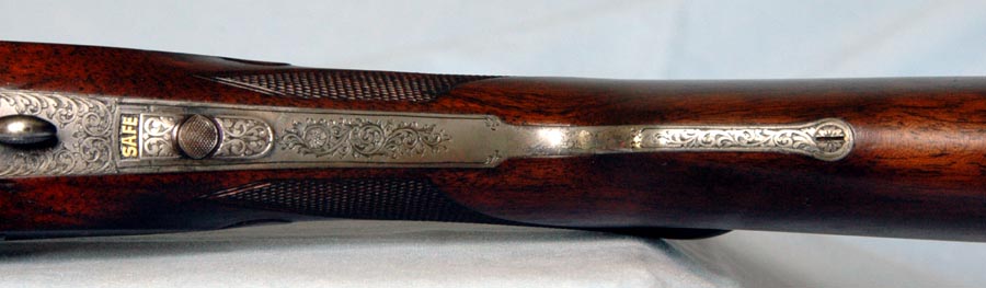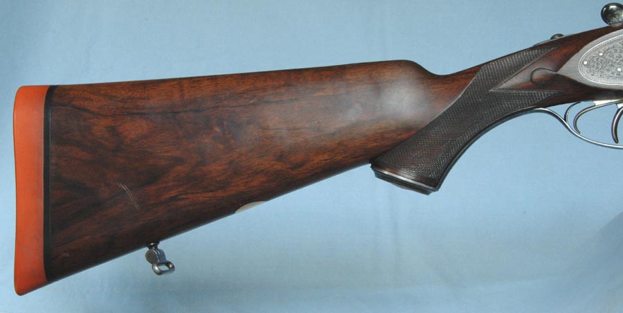 The left-handed attributes of this rifle are: “reversed triggers” – the front trigger fires the left barrel; rolled trigger guard with the roll on the left side; and the left-handed cast to the stock. This is an extremely rare and unusual rifle.