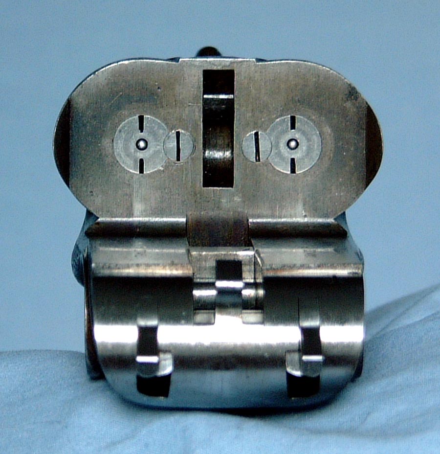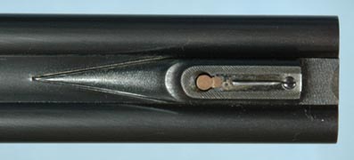 The barrels are 26” chopper lump proofed “Cordite 56 – 300 Max”, which is the standard original proof for the .375 Flanged Magnum. They are topped with a quarter rib with H&H “spear” front treatment. There is a ramp front sight with the same “spear” style. The standing rear sight is for 50 to 200 yards, and the two folding rear sights are for 350 yards and 500 yards. The front sight is equipped with a flip-up night sight. The rifle is fit with a 1.25 x 4 Schmidt & Bender 30mm tube scope set in H&H quick detachable mounts. The inside of the bores appear almost new. Inscriptions on the barrels are: Holland & Holland, 98 New Bond Street, London. The top rib is inscribed: .375 Magnum.