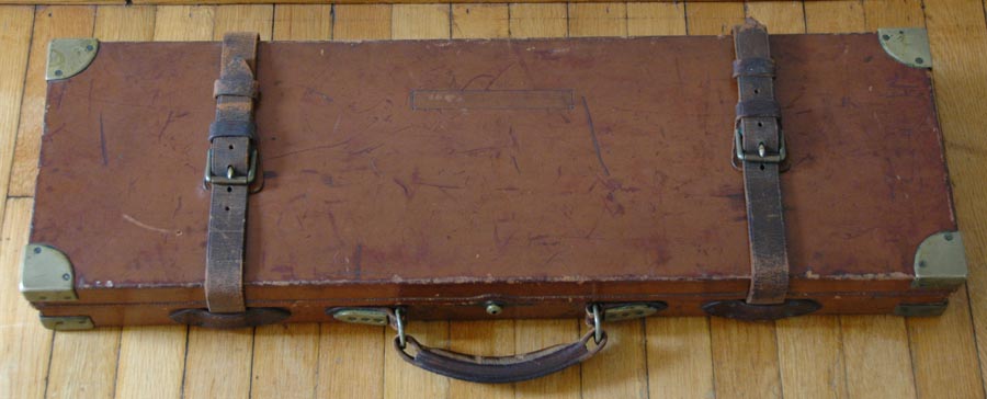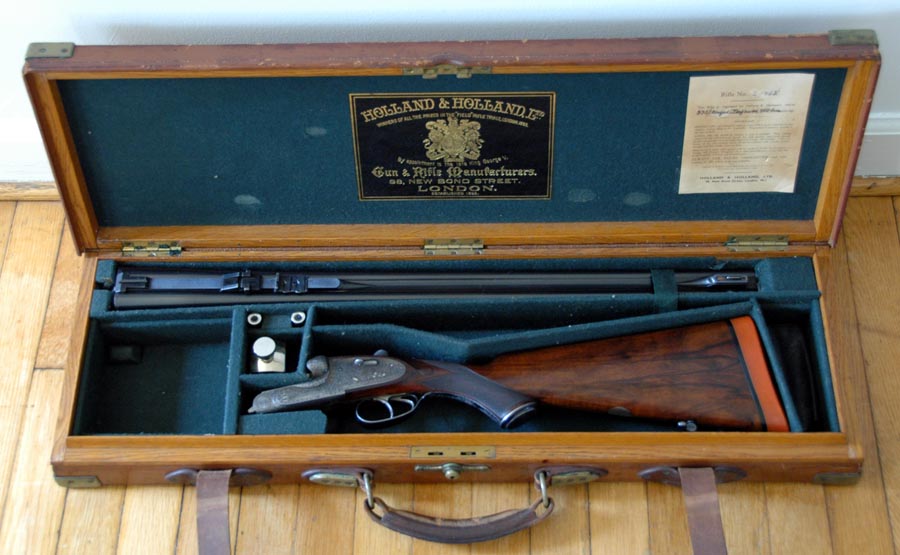 The rifle is equipped with its original sling swivels. There is a vacant gold oval in the customary location along the bottom of the butt. Weight is 10.04 lbs. without scope, and 11.35 lbs with the 1.25 x 4 Schmidt & Bender scope attached. It resides in its Holland & Holland Oak and Leather trunk case.