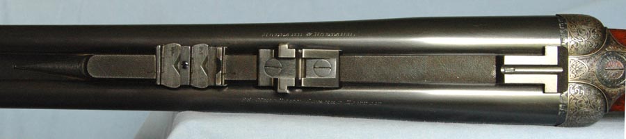The reinforced action has hand detachable sidelocks. All is adorned with perfectly executed H&H Acanthus scroll in a typical “Royal” pattern with rose bouquets. The engraving is crisp and sharp as if done yesterday. All screws are properly aligned, with perfect slots. Inscription on the bottom of the action reads: Royal Hammerless Ejector.