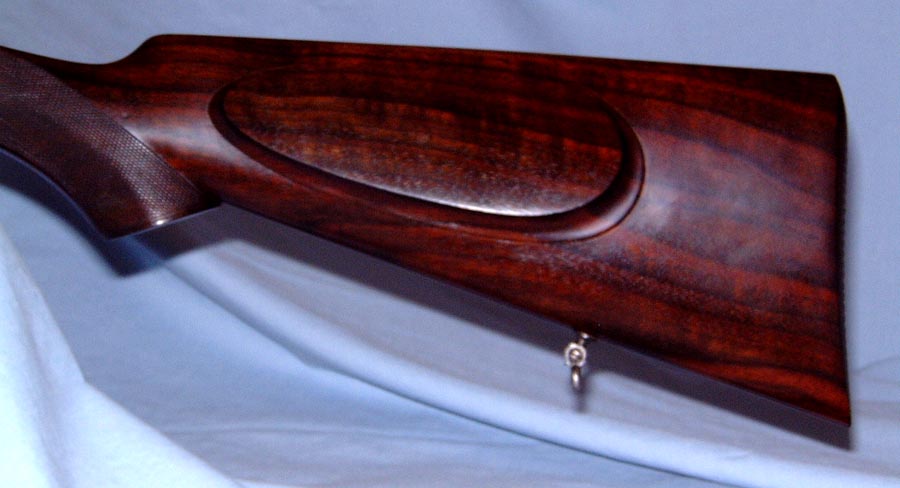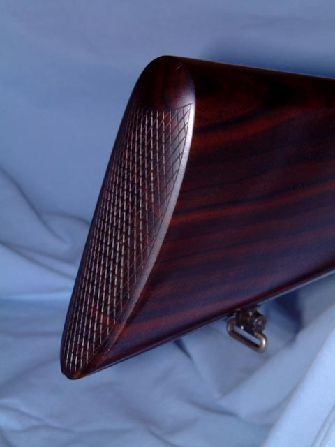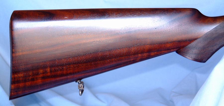 Stocked to the fences with a beautifully figured piece of dark streaked quarter-sawed French walnut with semi-pistol grip, point-pattern checkering, oval cheekpiece, and checkered butt. Splinter forend with Anson latch.