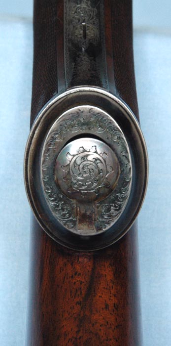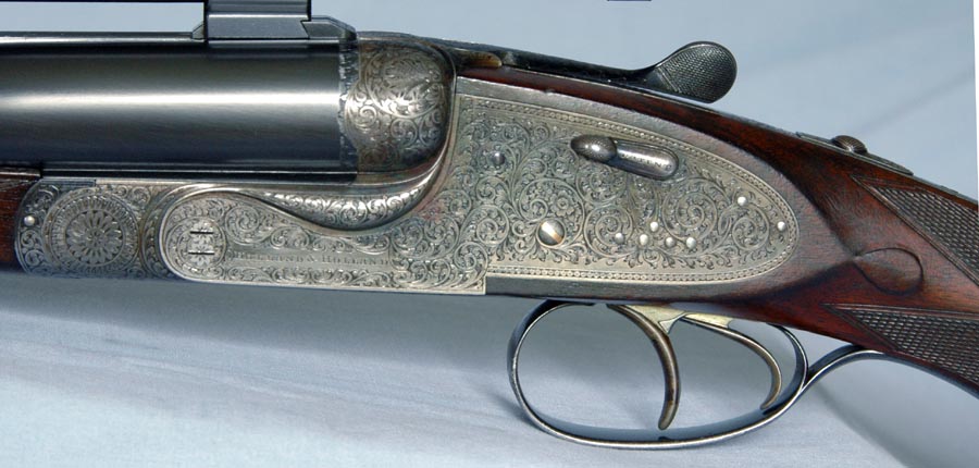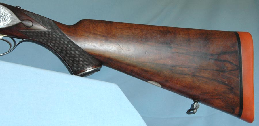 The left-handed attributes of this rifle are: “reversed triggers” – the front trigger fires the left barrel; rolled trigger guard with the roll on the left side; and the left-handed cast to the stock. This is an extremely rare and unusual rifle.