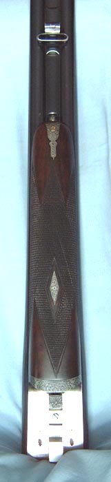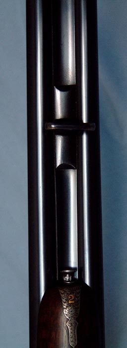 The reinforced action has hand detachable sidelocks. All is adorned with perfectly executed H&H Acanthus scroll in a typical “Royal” pattern with rose bouquets. The engraving is crisp and sharp as if done yesterday. All screws are properly aligned, with perfect slots. Inscription on the bottom of the action reads: Royal Hammerless Ejector.