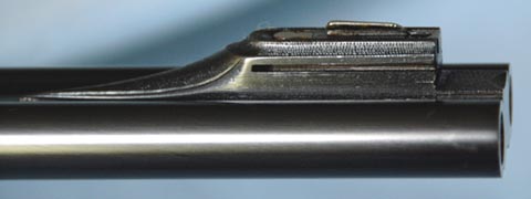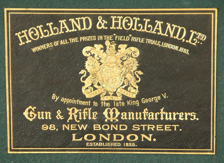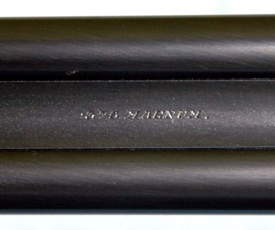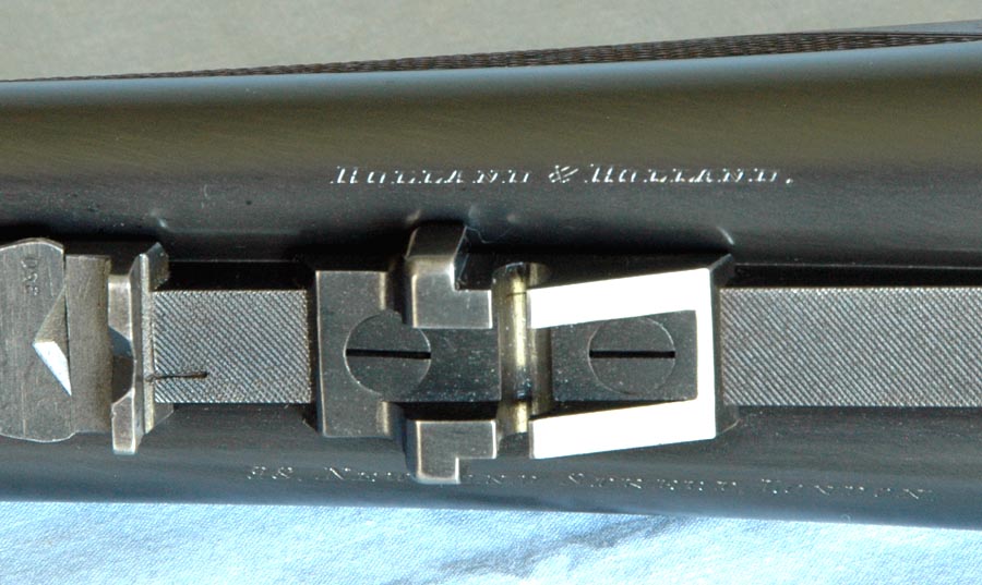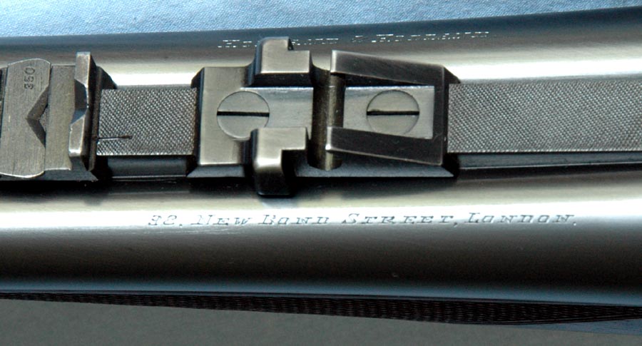 The barrels are 26” chopper lump proofed “Cordite 56 – 300 Max”, which is the standard original proof for the .375 Flanged Magnum. They are topped with a quarter rib with H&H “spear” front treatment. There is a ramp front sight with the same “spear” style. The standing rear sight is for 50 to 200 yards, and the two folding rear sights are for 350 yards and 500 yards. The front sight is equipped with a flip-up night sight. The rifle is fit with a 1.25 x 4 Schmidt & Bender 30mm tube scope set in H&H quick detachable mounts. The inside of the bores appear almost new. Inscriptions on the barrels are: Holland & Holland, 98 New Bond Street, London. The top rib is inscribed: .375 Magnum.