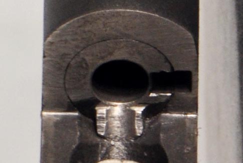 left barrel flute about midway down, very slight pinprick pitting at the front left of the muzzle, and some slight blue wear