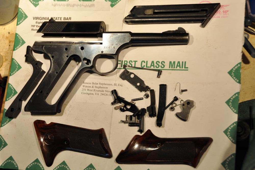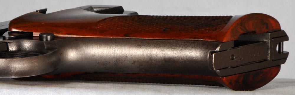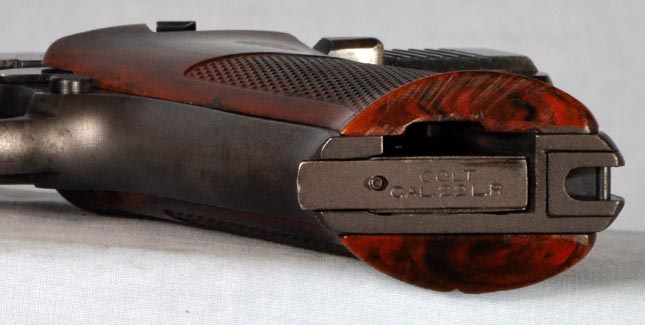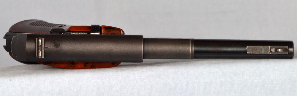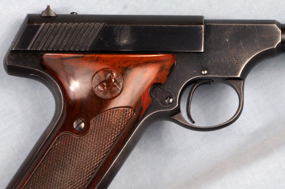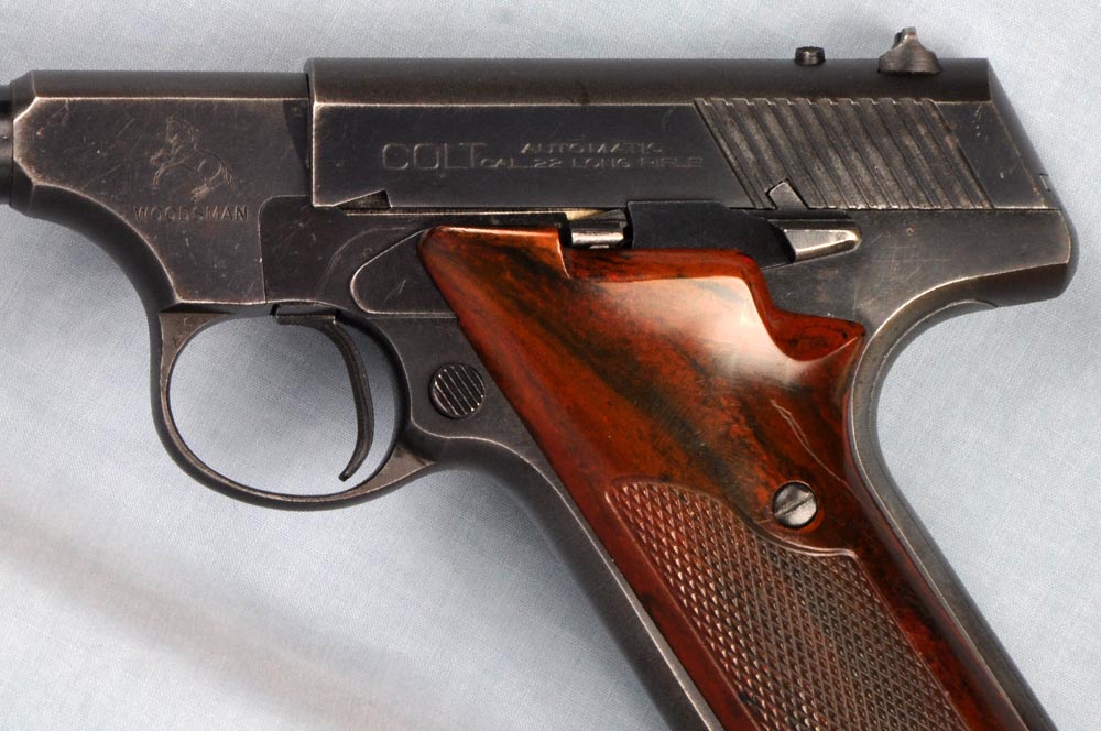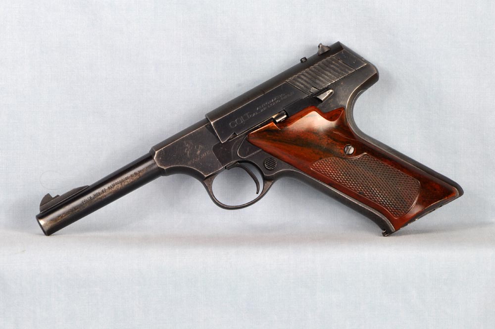 This is a nice Second Series Sport Model, made in 1950. It remains in good original condition with perfect mechanicals. It has a correct, original, and beautiful set of dark brown "Coltwood" bakelite grips. This particular model, with fixed sights, was made only for a little more than a year. It is the perfect kit gun, being especially petite with low profile sights and no thumb rest on the grip. It would be hard to find a better carry pistol. This one has holster wear on either side of the barrel, and just a little sharp edge blue wear. Finish on the front and rear grip straps is a bit thin. Otherwise, the finish is strong with some freckles and minor blemishes. It has a perfect bore. The action is smooth as silk. This is a nice Woodsman that shows a fair amount of carry. It absolutely cries out to be taken afield. It is a great shooter and certainly is ready for another 62 years of service.