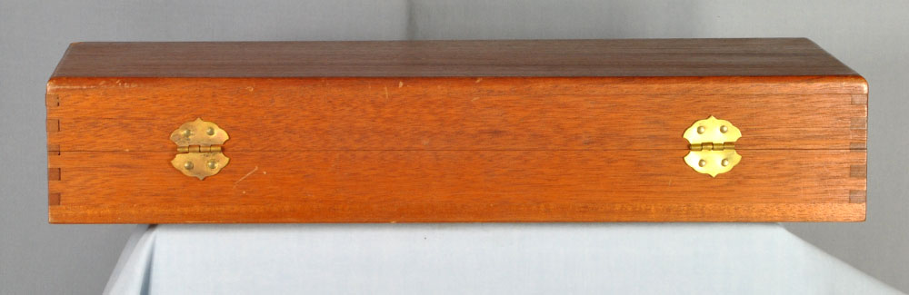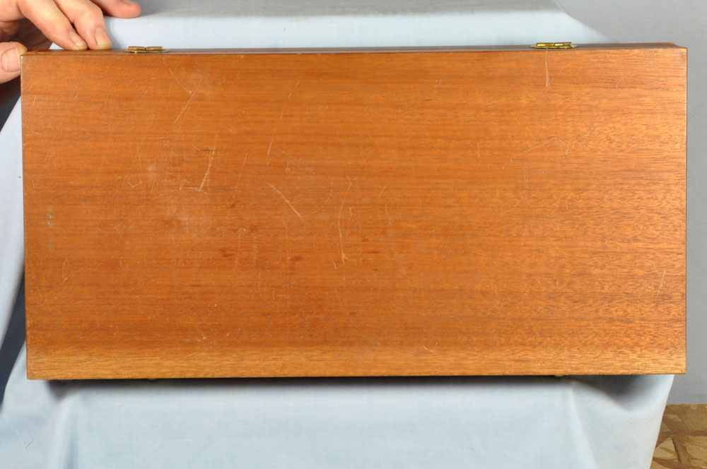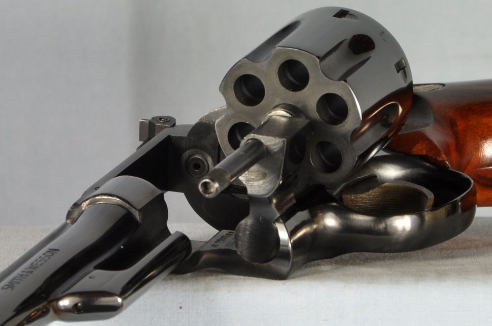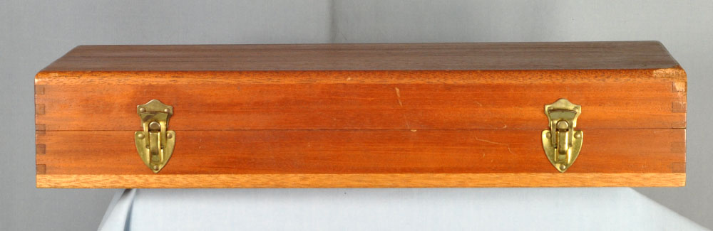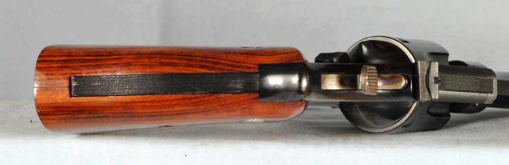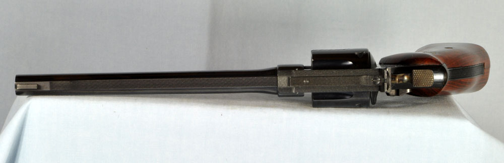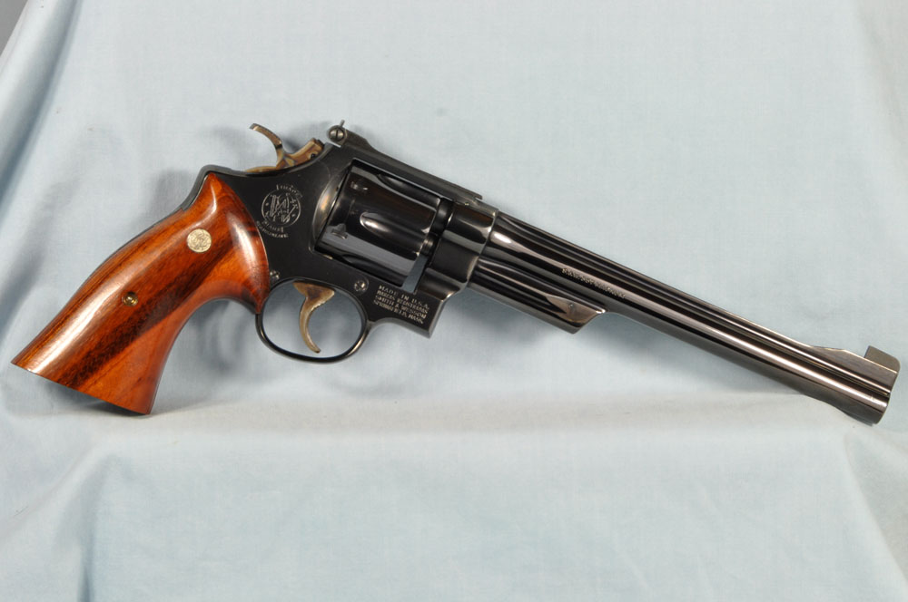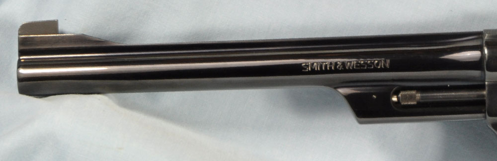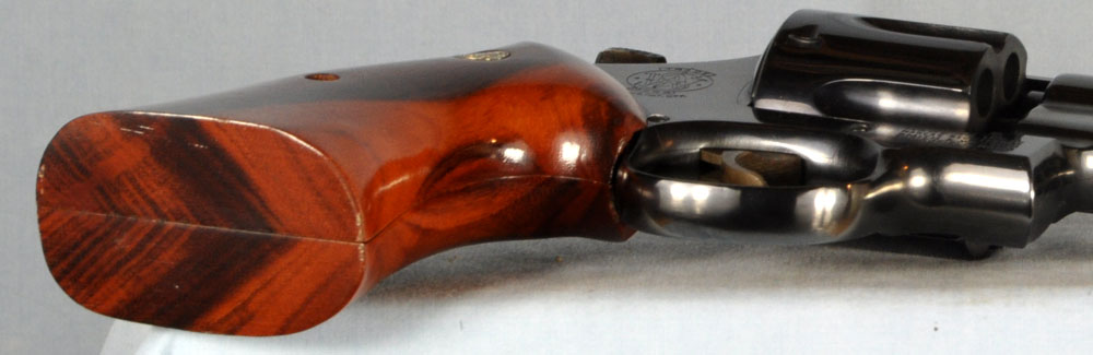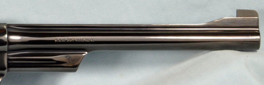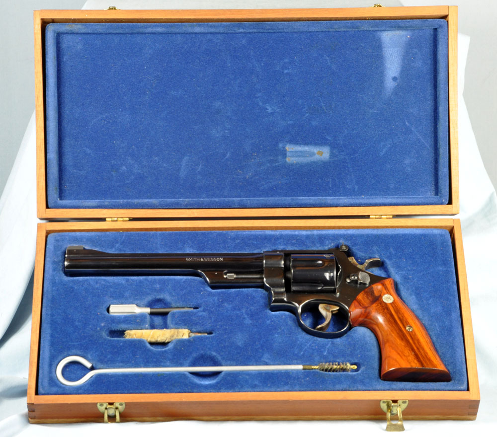 This is one gorgeous Model 27 in its presentation case. You probably know, the Model 27 was the top of Smith & Wesson's line, in terms of fit and finish. It was their only model to have intricate checkering of the barrel rib and the top of its frame. What a beautiful detail it was, held over from the days of the Registered Magnum. In 1934 Elmer Keith collaborated with Smith & Wesson to invent the .357 Magnum cartridge. It made a big splash in 1935 when introduced as the now famous Registered Magnum - their preeminent offering of the time. The cartridge certainly caught on, as did Smith & Wesson's big N-frame revolver chambered for it. When Smith & Wesson resumed civilian production following WW2 the .357 Magnum reappeared in improved form with the new hammer block safety and faster lock time from its "short action." In 1957 Smith & Wesson assigned model numbers to their guns, and this became the now familiar Model 27. This wonderful example has seen little use. The recoil shield shows it has been fired some, but there is no other indication of wear to be found. It has as pretty a pair of bookend-cut presentation grips as I have seen. It has a target hammer and target trigger. It is, of course, "pinned and recessed." The 8-3/8" barrel, while not designed for concealed carry, makes for some really accurate and comfortable shooting. It gives a steady, weight forward hold, and it delivers maximum velocity from the .357 Magnum cartridge. The mahogany presentation case is shown just as it came to me. Obviously a bit of furniture polish and some hand rubbing will restore it to virtually new on the outside. The molded inside of the case is in quite good condition for an example of this age. The only damage is the gouge where the rear sight rests. You will commonly see this and worse. All in all, the case is really good for its age. This is one fine collectible package from days when Smith & Wesson was really "doing it right." Nobody builds a revolver to this standard in today's market, and certainly not at this price.