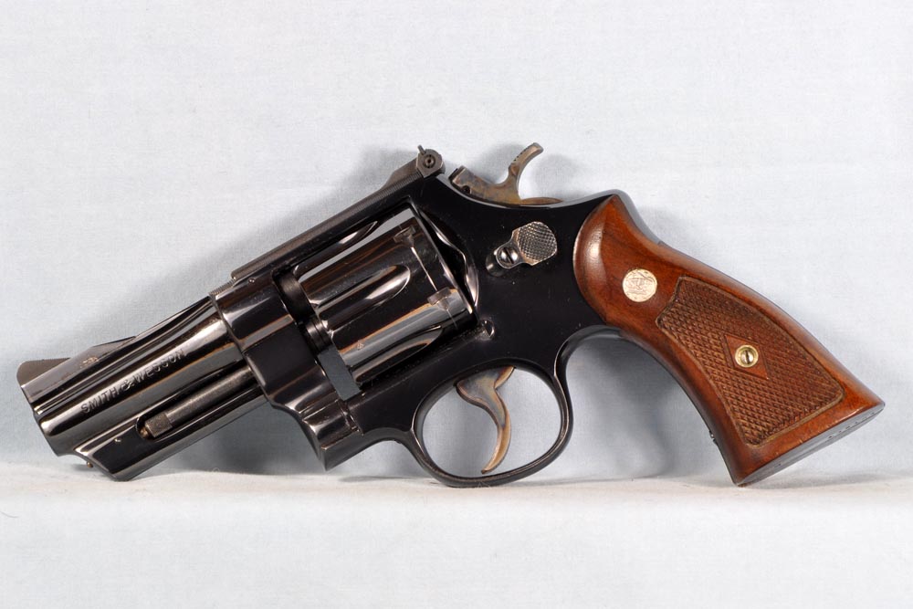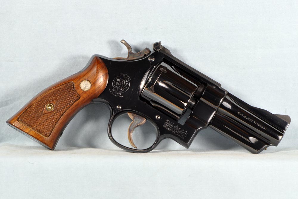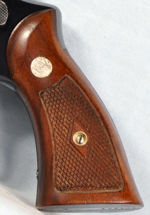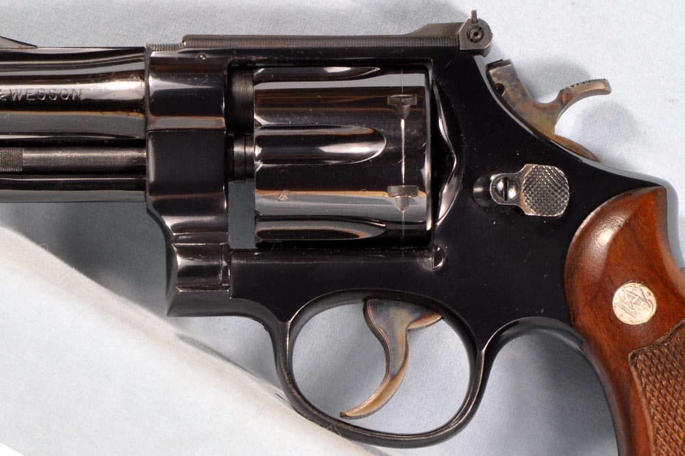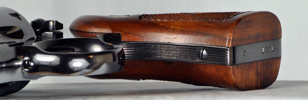 This is a nice example of the five screw Pre-Model 27 with the highly desireable 3-1/2" barrel. This revolver shipped from Smith & Wesson in September 1957. It is all original, without any repairs or alterations. The bore and chambers are mint. The recoil shield indicates it has been fired, but not a lot. It locks up tight and times correctly, with perfect mechanics. The original high polish carbona blue finish is just beautiful. It is difficult to accurately photograph a bright finish like this. The revolver just glowes in your hand. The finish shows a bit of thinning on the thumb latch. Like many S&W revolvers of this period, this one has a slight spot of flaking on the left side of the front sight originating from the joint between the rib and front sight. This looks much worse in my photos than in hand. There is no flaking on the right side. You can also see some slight "spider web" discoloration on the left side of the barrel just ahead of the frame. Again, this looks prominent in the photos but not in hand. Finally, there is one spot of flaking near the front of the cylinder you can see in the first and second photos. There are no other marks on this gun. Remarkably, it doesn't show any holster wear. The walnut magna grips are flawless. They are original and numbered to the gun. All parts have numbers matching the serial number, including the cylinder, ejector star, yoke, and barrel. There are no re-work stamps. The revolver is entirely original in mechanics and finish. This is truly a superior example of the iconic Smith & Wesson .357 Magnum.