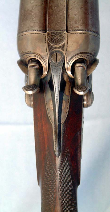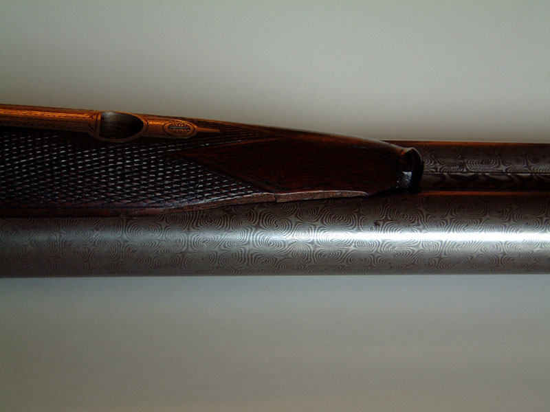 The barrels are excellent. They have no dents, bulges, or other damage. There are scattered very light pits. The barrels are clean and shiny their full length, with original exterior finish showing excellent tight damascus pattern. The barrels ring like chimes. The rib is a smooth concave game rib.