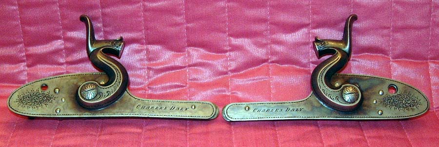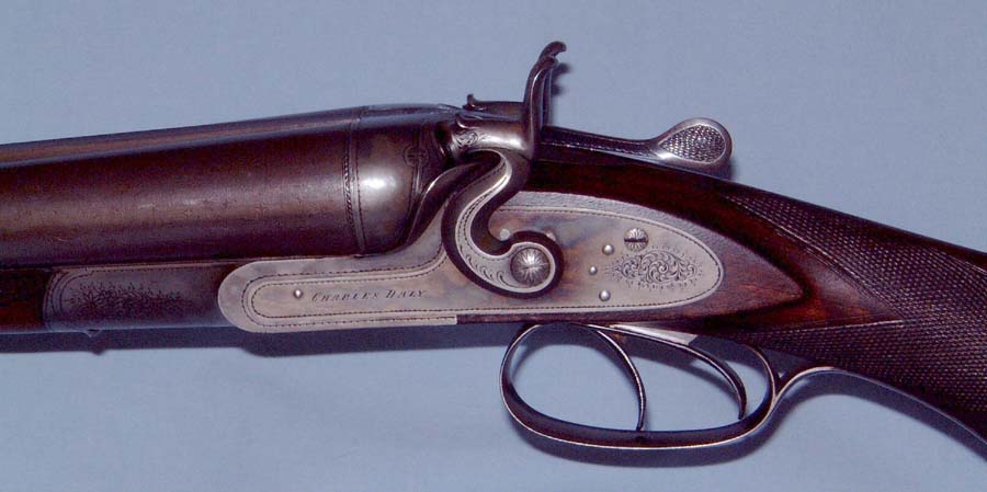 MARKINGS: "Charles Daly" on each sidelock; crown over two crossed pistols (Linder trademark) on bottom of each barrel ahead of the flats; "Charles Daly Fine Damascus Barrels" on rib.